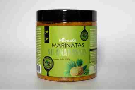 Augaliniai aliejai (rapsų aliejus, rapsų aliejus visiškai hidrintas), mišinys (ananasų sulčių milteliai 23,5 % (ananasų sulčių koncentratas 50 %, maltodekstrinas), svogūnai, cukrus, česnakai, juodieji pipirai, GARSTYČIOS, citrinų sulčių milteliai (citrinų sulčių milteliai, natūrali kvapioji medžiaga), imbieras, rūkyta saldi paprika, rūgštingumą reguliuojanti medžiaga citrinų rūgštis., kalendrų lapeliai, mielių ekstraktas, kardamonas), druska, ananasų kvapioji medžiaga 0,1 %.