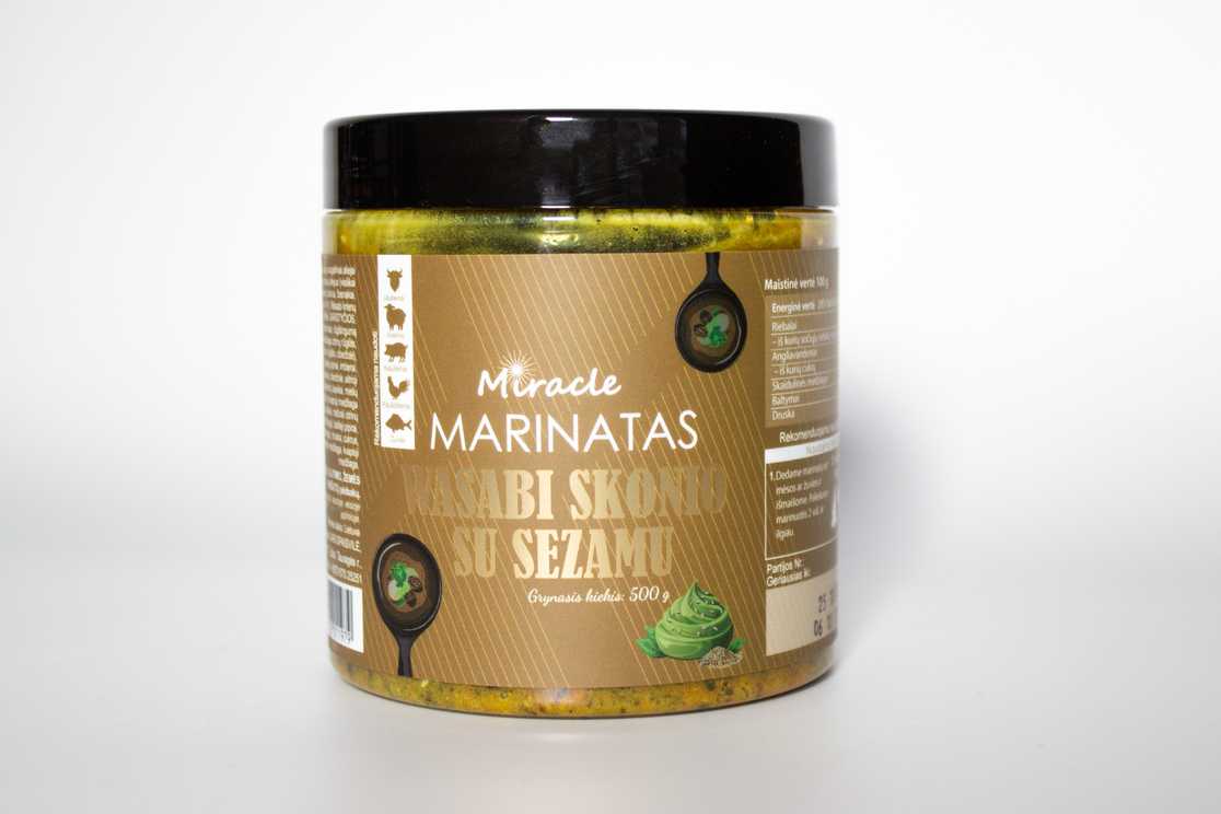 Augaliniai aliejai (rapsų aliejus, rapsų aliejus (visiškai hidrintas)), mišinys (cukrus, česnakai, SEZAMO sėklos 14 %, Wasabi krienų milteliai 11 % (krienai, GARSTYČIOS, kukurūzų krakmolas, rūgštingumą reguliuojanti medžiaga citrinų rūgštis, askorbo rūgštis , ciberžolė), GARSTYČIOS, juodieji pipirai, imbierai, raudona saldi paprika, ciberžolė, aitrioji paprika, kalendrų lapeliai, mielių ekstraktas, citrinų kvapioji medžiaga (citrinų sulčių milteliai, natūrali citrinų kvapioji medžiaga), baltieji pipirai, mėlynžiedė ožragė), druska, cukrus, natūrali kvapioji medžiaga, kvapioji medžiaga.