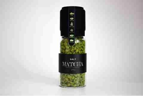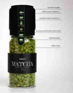 Jūros druska 94,7 %, matcha 5 %, ypač tyras alyvuogių aliejus.