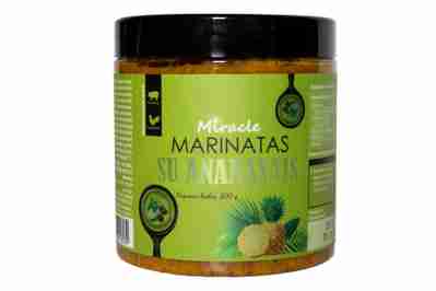 Augaliniai aliejai (rapsų aliejus, rapsų aliejus visiškai hidrintas), mišinys (ananasų sulčių milteliai 23,5 % (ananasų sulčių koncentratas 50 %, maltodekstrinas), svogūnai, cukrus, česnakai, juodieji pipirai, GARSTYČIOS, citrinų sulčių milteliai (citrinų sulčių milteliai, natūrali kvapioji medžiaga), imbieras, rūkyta saldi paprika, rūgštingumą reguliuojanti medžiaga citrinų rūgštis., kalendrų lapeliai, mielių ekstraktas, kardamonas), druska, ananasų kvapioji medžiaga 0,1 %.