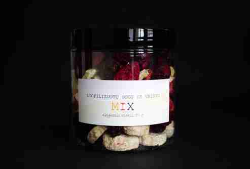 Liofilizuotos uogos 60 % (vyšnios, gervuogės, braškės), liofilizuoti vaisiai 40 % (bananai, ananasai).